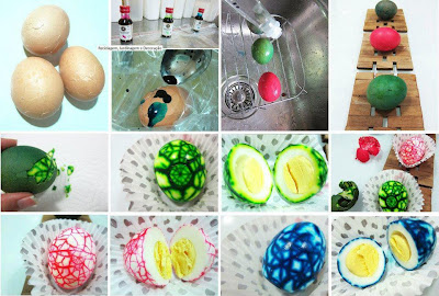Ich weiß nicht, ob ihr die facebook-DIY- Seite (https://www.facebook.com/DoItYourselfOfficial) kennt, aber von dort habe ich die Idee, bei den hart gekochten Eier die Schale schon kaputt zu machen und dann mit Hilfe von Lebensmittelfarbe und Essig zu färben. So bekommt das Ei ein schönes Netzmuster, ich bin gespannt, ob wir das eben genau so gut hinbekommen haben! ;)